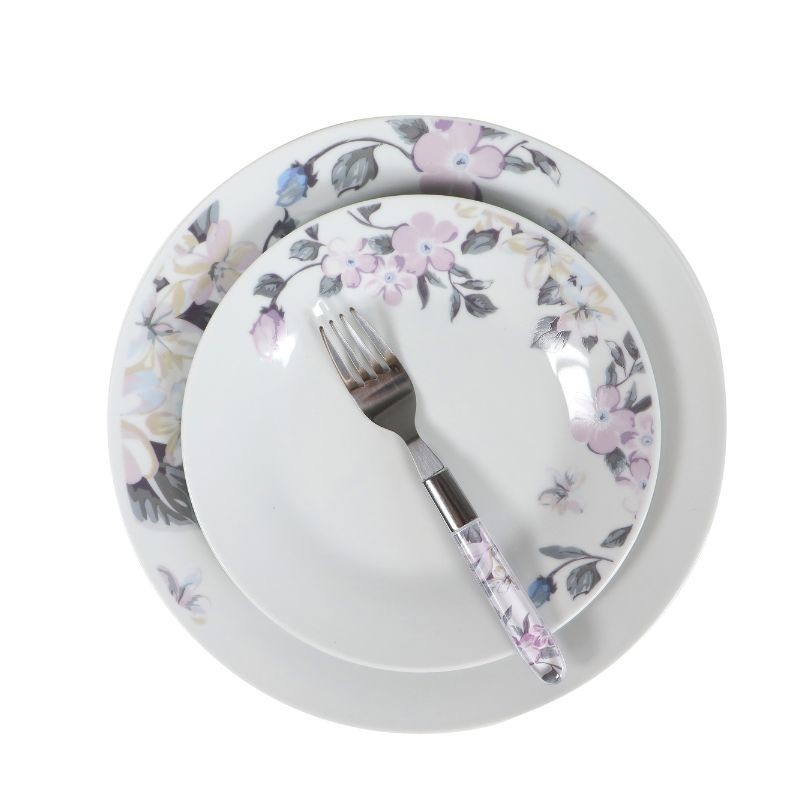 Set čini 6 tanjira za kolače (18cm), 1 tanjir (23cm) i 6 viljuškica.